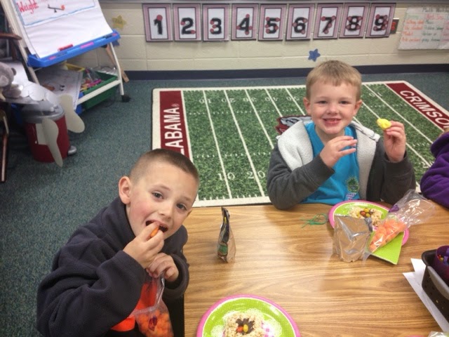 I loves our snack ! We had a bird, a nest, and a carrot. Well, technically it was a Rice Krispy treat "nest" (I used chocolate to hold the "eggs"/jelly beans in place), a Peep, and cheese balls.